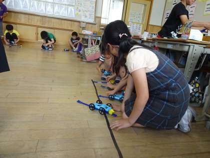 「ゴムや風でものをうごかそう」の学習で,車を作って実験を進めようと準備をしています。車作りが終わった子から,走らせていました。明日は,ゴムのはたらきの実験を行います。