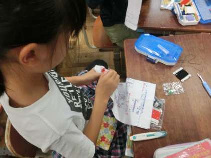水曜日に,家庭科でボタン付けを学びました。2つ穴,4つ穴のボタンを付けて,練習したり作品を作ったりしました。針に気を付けながら,楽しくボタン付けをしていました。