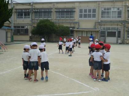 ころがしドッヂの試合中に,子どもたちが集まって話をしていました。近づいて聞いてみると,チームで協力して「作戦」を考えているところでした。「どうしたら相手にボールを当てることができるのか。」「どうしたら,相手のボールをうまくよけることができるのか。」など,チームで話し合いながら作戦を考えていました。
