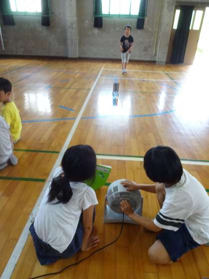 風の強さをかえて,車のすすむ長さを調べました。送風機を使って,強い風・弱い風で実験しました。結果がはっきりと出て,楽しい実験だったようです。