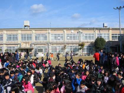 体育館の耐震補強工事に伴って,経路も一部変更しましたが,避難開始から4分15秒で全児童が整列し避難完了することができました。