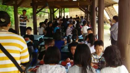 2日目の朝食をあずまやで食べています。しっかり食べて、今日も元気よく過ごしましょう!