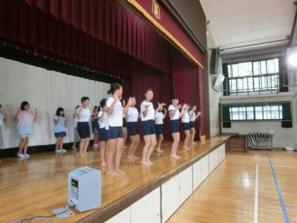 今日の中間休みに,運動会の全校ダンスの練習をしました。今日は低学年が練習をしました。(高学年は明日実施します。)ダンスクラブの子どもたちがステージでお手本になり,そのお手本を見ながら子どもたちが音楽に合わせて踊っていました。