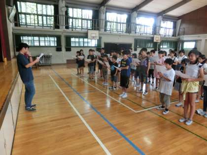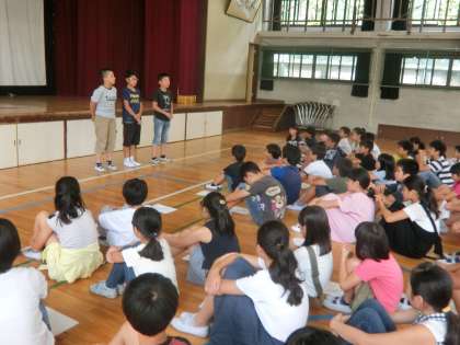 昼休みに,応援団の結団式を行いました。応援団の心得をみんなで唱和したあと,団長が団長としての意気込みを語りました。その後,各団に分かれて自己紹介を行いました。子どもたちのやる気に満ちた目に,これからの活動が楽しみになってきました。
