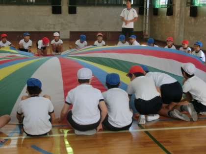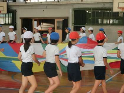 講堂で,にじの子学級の団体演技『みんなでおどろう えがおのWA!』の練習をしました。5年生の子どもたちと一緒に,大きなバルーンを膨らませる見応えのある演技です。本番をお楽しみに。