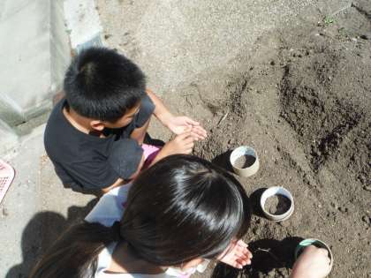 白菜とネギは苗を植え,大根とカブは種をまきました。ネギの苗は,1度干した苗で,上の部分を切って植えました。大根とカブは小さな種なので,ていねいにやさしくまきました。「おいしくなあれ。」「元気に育ってね。」とかわいらしい声が聞こえてきました。