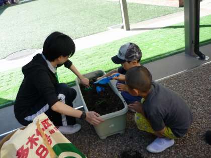先週みんなで話し合った,「秋から育てたい野菜」の植付けをしました。植付けの準備では,重い重いプランターを協力して運ぶ子どもたちの力にびっくしました。