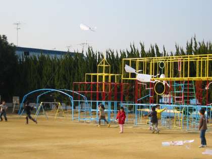校舎に囲まれた運動場では,たこあげに適した風があまり吹いてくれません。