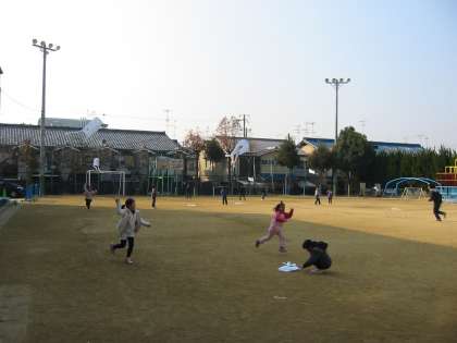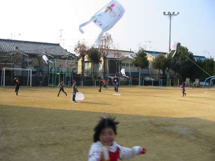 今日は、少し気温が上がり 幾分暖かかったので,運動場でたこあげをしました。