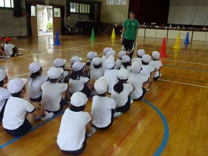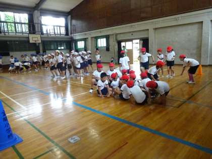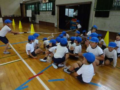 今日は,雨のため外で練習することが出来ませんでした。何度も雨で中止になることが多かったため,講堂で練習を行いました。ただ,竹の棒を使って台風の目を講堂で行うことが出来ないため,竹の代わりに長縄を使って練習しました。子どもたちは,竹が長縄に変わってもいつものように頑張って練習していました。