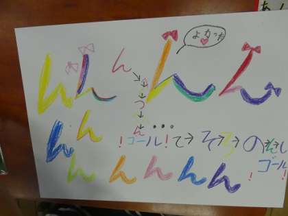 平仮名の「ん」がいろいろなものに変身したり,「ん」と一緒に主人公が「”ん”どうかい」に行ったりするお話を聞いて絵を描きます。今日は「どんな”ん”かな?」と想像した「ん」をかきました。色や形を工夫していたり,動きを考えたりして,お話の世界を楽しんで描くことができました。