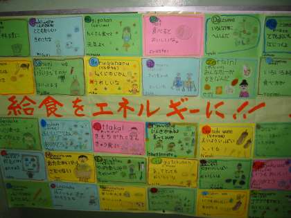 給食週間の作品「よせがき」を職員室前・南校舎1階に掲示しています。