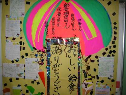 給食週間の作品「よせがき」を職員室前・南校舎1階に掲示しています。