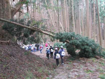 寺山峠を過ぎると、尾根伝いの歩きやすい道になります。遠くに見える、花背山の家の本館に「ヤッホー!」と叫ぶと、ちゃんと届きました。旧花脊峠では、先日の台風による倒木がたくさん残っており、くぐったりまたいだりしながら進まなければならないところもありました。