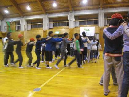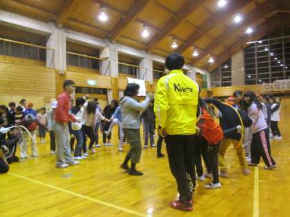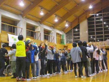 19時から、プレイホールでナイトゲームをしました。フープくぐりリレーやボール送り、二人三脚、じゃんけん列車をして、みんなで楽しい時間を過ごしました。