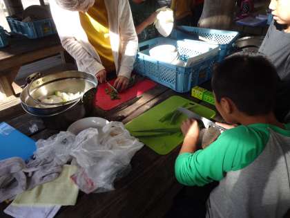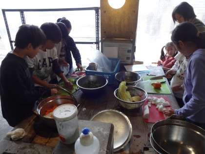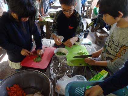 午後の活動は、野外炊事。ご飯を炊き、豚汁を作りました。まだぎこちなさはありますが、みんな一生懸命に作り、おいしい晩御飯をいただくことができました。