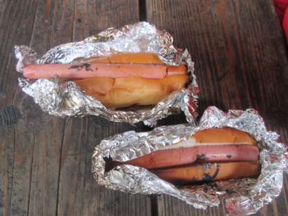 外側の牛乳パックが燃えきったら、ほかほかのホットドッグの完成です。朝から自分たちで作る朝食は、花脊山の家ならではの活動です。みんなでおいしくいただきました。