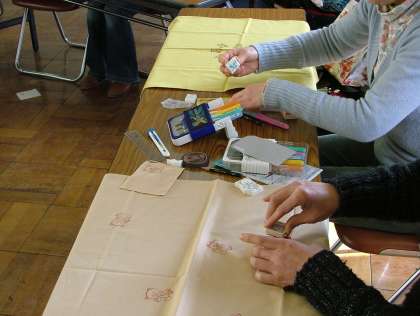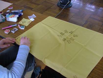 作ったスタンプで,ランチョンマットにスタンピングしました。