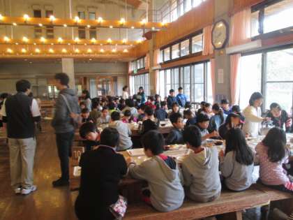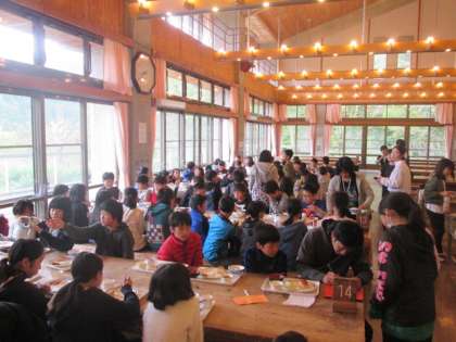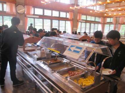 花脊山の家の食堂でいただく食事も残りわずか。味わって食べてほしいです。今日は、このあと、研修室でまとめの新聞作りをしたあと、冒険の森でアスレチックをする予定です。