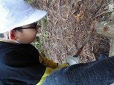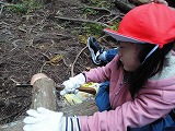 写真は,林業体験の様子の写真です。みんなで1本の杉を引っ張った後に,その杉を一人一人のこぎりで切りました。