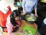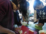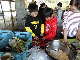 写真は,野外活動の様子の写真です。班の友達と一緒に協力して調理を行うことができました。調理だけではなく準備や後片付けも進んで行うことができました。