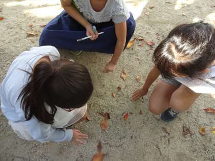 今日は,とてもいいお天気だったので日なたと日かげのちがいを調べました。予想を先にしてから外に出て確認しました。また,実際に日なたと日かげの地面を触って温かさやしめり具合を調べ,日なたの方が温かいことに驚く子もいました。