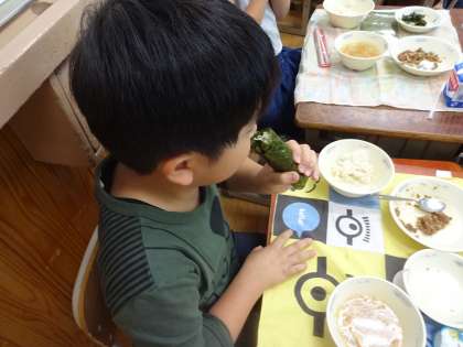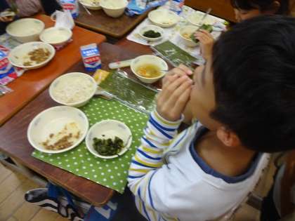 今日の献立は,1年に1度の献立の「肉みそなっとう」でした。のりまきに巻いて,とてもおいしそうに食べていました。