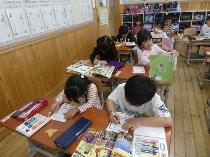 運動場を歩いたり,登下校の中でみつけた「秋」をカードにかきました。「もっとみつけたい。」「遠足が楽しみになってきたよ。」と「秋みつけ」を楽しんでいる様子でした。子どもたちがかいた「秋みつけカード」は,一年教室の手前の廊下の掲示板に掲示しています。