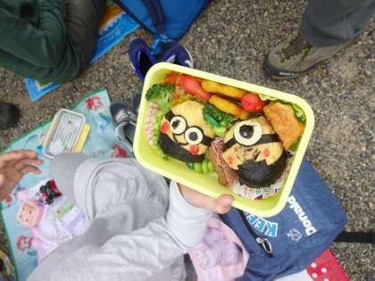 お昼は,子どもたちが楽しみにしていたお弁当を食べました。少し雨がぱらつきましたが,みんなで楽しく食べました。
