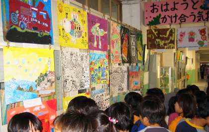 今年度は,体育館を改修工事しているため,各教室廊下で展示をしています。