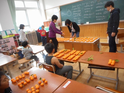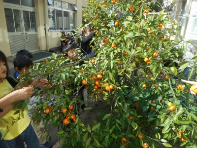 にじのこガーデンにたくさん実ったみかん。先週まで生活単元学習で取り組んでいた「にじのこカフェ」では,みかんケーキを作りました。今日は,まだ木に残っているみかんを全部収穫しました。大きな箱にたくさ〜んのみかん。「いくつくらいありそうかな?」と子どもも大人も予想をした後,10ずつまとめて数えました。結果は435個。予想が近かったのは,本気の大人ではなく,子どもでした。今まで収穫した分を合わせると,きっと500個を超えるたくさんのみかん。びっくりの大豊作です。