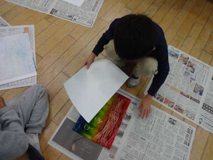 図画工作「いろいろうつして」では,先週彫ったスチレンボードにインクを塗って刷りました。どんなふうに仕上がるのか楽しみにしながら和紙をめくっていました。