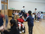 にじの子学級のみんなが教室に集まって,音楽の学習を行いました。今日の音楽は「なまえ」「はるるるる」「よろしくね」「わたしとエクササイズ」の4曲を行いました。みんなで季節の歌を歌ったり,曲に合わせて体を動かしたりすることで,一緒に学習を楽しみながら関わる姿が見られました。