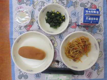 今日のメニューは、小型コッペパン、牛乳、スパゲッティ—のミートソース煮、ほうれん草のソテー、りんごゼリーです。