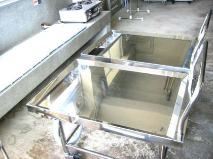 (ステンレスワゴン)食材の運搬台,下処理を行い洗浄し裁断した食材をワゴンに乗せて回転釜に運びます。