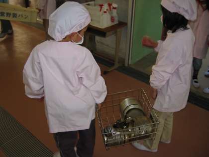 1年生もピンクのエプロン帽子をつけて,給食当番です。