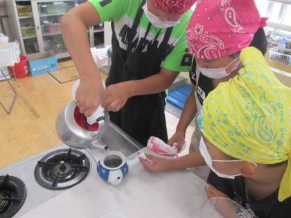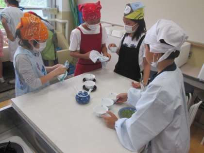 「我が家にズームイン!」という単元のなかで、お茶のいれかたについて学習しました。エプロンと三角巾を身につけて、グループのみんなで協力して、おいしいお茶をいれることができました。