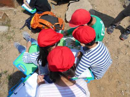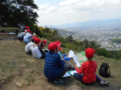 17日の金曜日に、社会見学で大文字山に登りました。頂上では地図を使って京都市の様子を確認しました。最後はみんなで景色を見ながらお弁当を食べました。