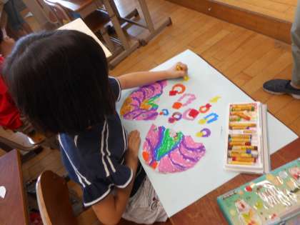 図画工作で「ひみつのたまご」の絵画を描いています。