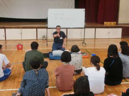 本日,「救命救急講習」という教職員研修を行いました。北消防署の職員の方々を講師としてお招きし,水泳学習を間近に控え,いざというときのために,心肺蘇生法について学びました。