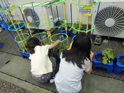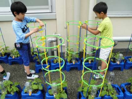 支柱を立てた日の放課後には,つるが支柱に巻きついていました。間引きをしてから,よりいっそうぐんぐん成長していくアサガオにとても愛着が湧いている一年生です。