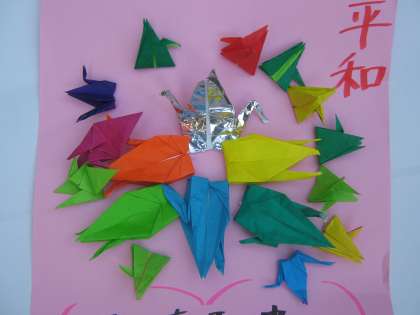 平和記念公園の中にある「原爆の子の像」の前にみんな集まり,平和集会をしました。そして,みんなで作った折り鶴を平和への誓いとして置いてきました。