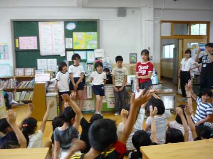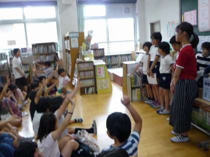 今日の中間休みは,中学年を対象に○×クイズを行いました。図書委員さんが出す問題は,昨日よりもレベルアップした内容でした。「図書館にある机と椅子は,京都で育てられた木を使っている。○か×か。」正解は,○です。図書館に入ると木の香りがします。リラックスして,心静かに読書ができそうですね。