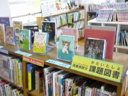 教室をのぞいてみると,おすすめの本を書いた「読書の木」が掲示してありました。のぞいてみると,いろいろな本の名前が書いてあります。おすすめの一冊を選ぶのに,読書ノートを見直しながら悩んでいた児童もいました。心に残る本との出会いを大切にしてほしいです。1年生は読んだ本の冊数をシールで貼りました。毎日3冊以上読んでいる児童もいました。図書館には新しい本が入りました。読書感想文コンクールの課題図書です。貸出はできませんが,ぜひ手に取って読んでみてください。