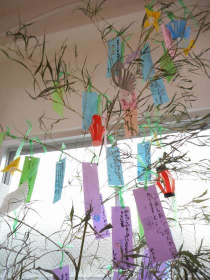 生活科の学習で,自分の願いを短冊にしたため,七夕飾りに付けました。