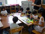 生活単元学習で,「1学期のにじの子学級お楽しみ会をひらこう」の学習を行っています。にじの子ガーデンやプランターで育てている夏野菜を使って,今年はどんな料理を作ろうかとみんなで考えました。その結果,今年は「夏野菜やきそば」と「夏野菜ピザ」を作ることになりました。また,みんなが楽しめる遊びも考えています。今日は,料理係担当,遊び係担当,飾り係担当にわかれて準備を進めました。