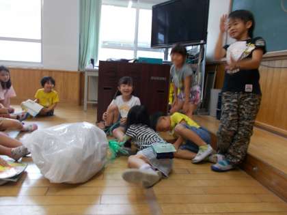 「おおきなかぶ」の音楽劇をしました。かぶが抜けたとき,とてもうれしそうな顔になっていたのが印象的です。楽しく劇をすることができました。