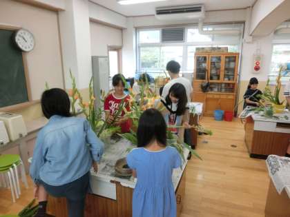 子どもたちは,先生のご指導を仰ぎながら,集中して花を生けていました。