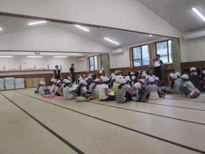 金閣小学校のベースキャンプは、90畳の大広間です。今日は男子が寝ます。女子はバンガローで寝ます。毛布や布団がきれいに並べられているので、帰るときは「来た時よりも美しく」して帰ります。