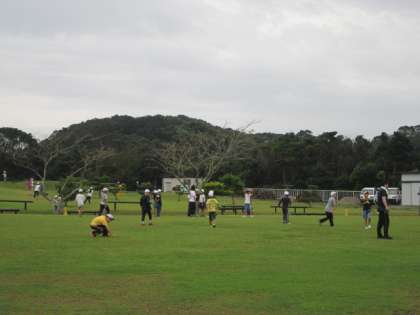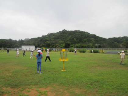 相変わらず降ったりやんだりの天気です。所内オリエンテーリングのあと、小雨が降っていたのですが、みさきの家の玄関のところで、全員の集合写真をとりました。そのあと、予定ではナイトハイクの下見だったのですが、雨が小止みになったので、芝生広場で遊ぶことにしました。学校の中庭の人工芝の何倍も広い芝生の上で、思い思いに楽しみました。